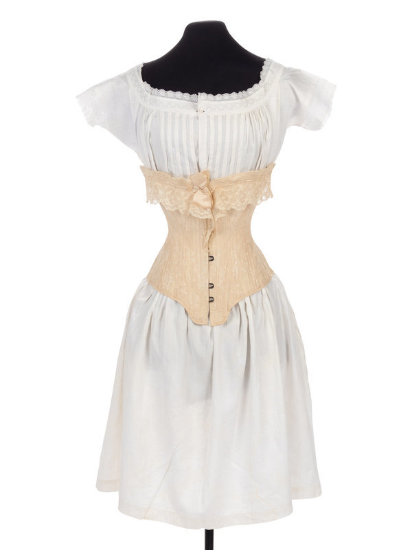 White cotton herringbone corset with front post and loop closure and back lace up. Laces are included, though likely not original.