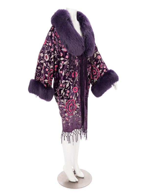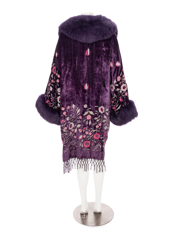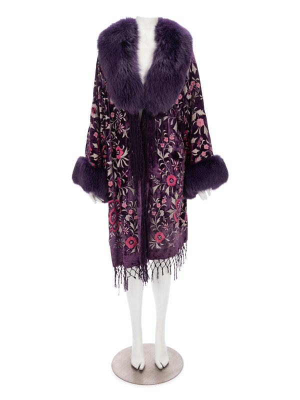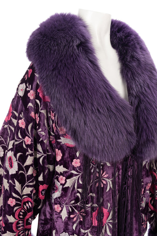 Purple velvet coat with pink and platinum toned silk embroidery, purple knotted braided cord fringe trim, and purple fox fur on collar and sleeve cuffs.