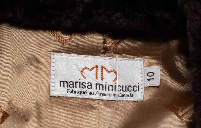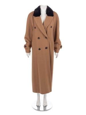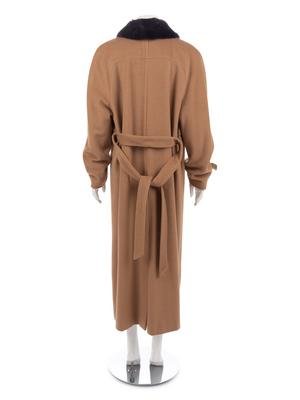 Tan camel hair double breast long coat trimmed with sheared beaver and tie belt.