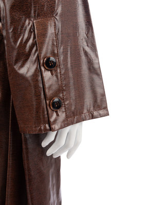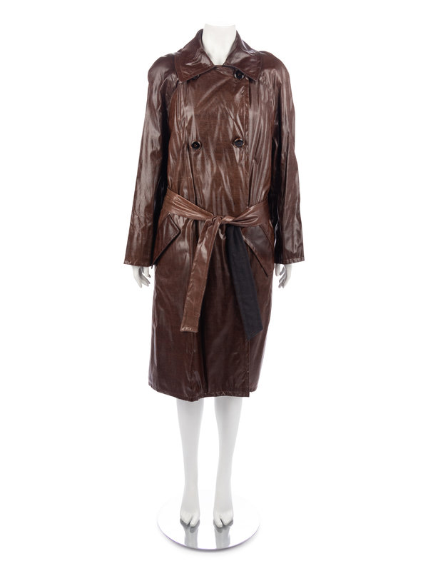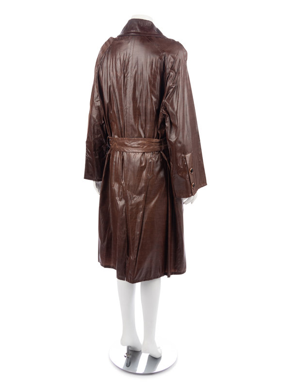 Brown acetate/poliuretanica spandex/polyurethane blend double breast rain coat with silver rayon quilted interior, front hip flap pockets, and tie belt.