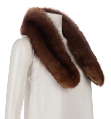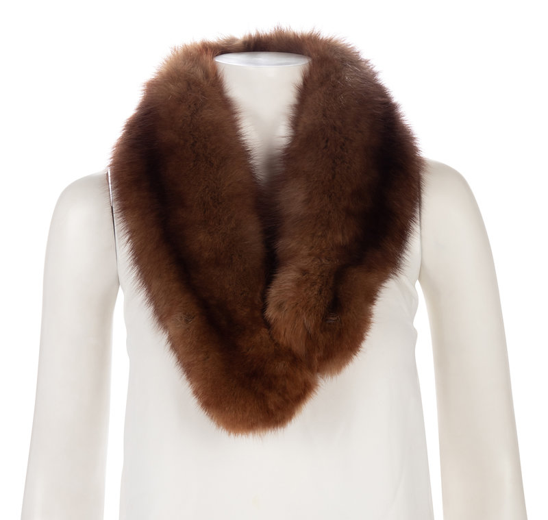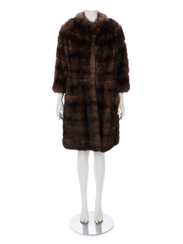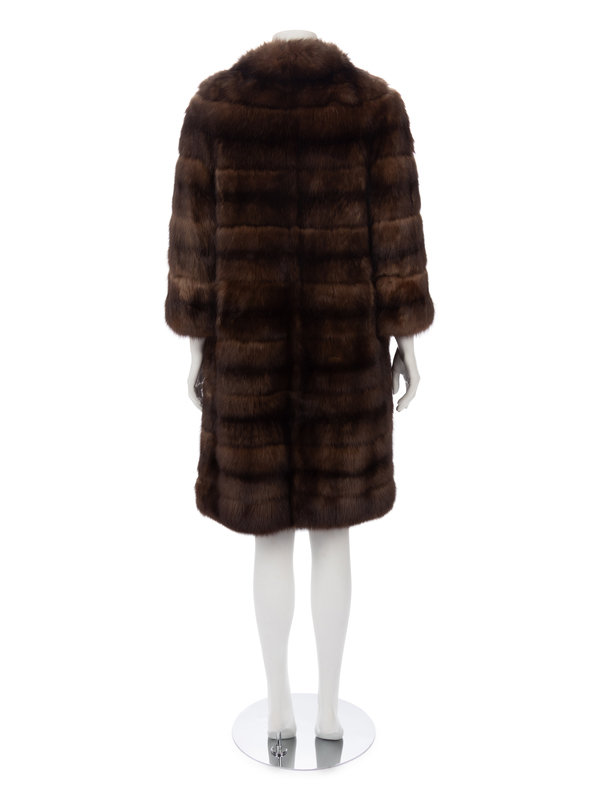 Brown sable fur coat with stand collar, straight fit sleeves, and front hip pockets; paired with two sable fur collars: one matching collar with a front slip loop, labeled: "Alexandre", one reddish fur collar with two hinged clips.