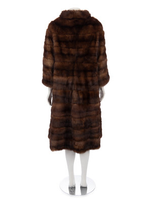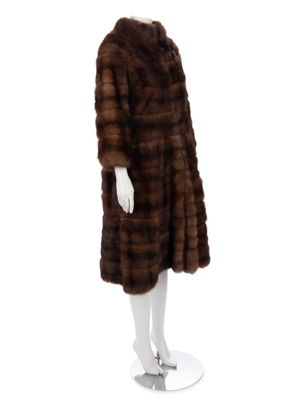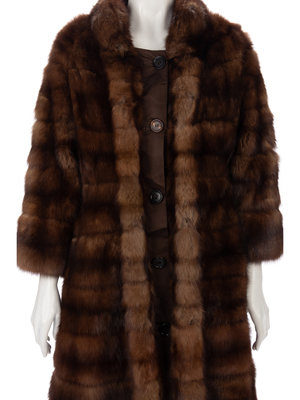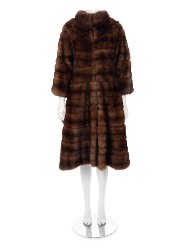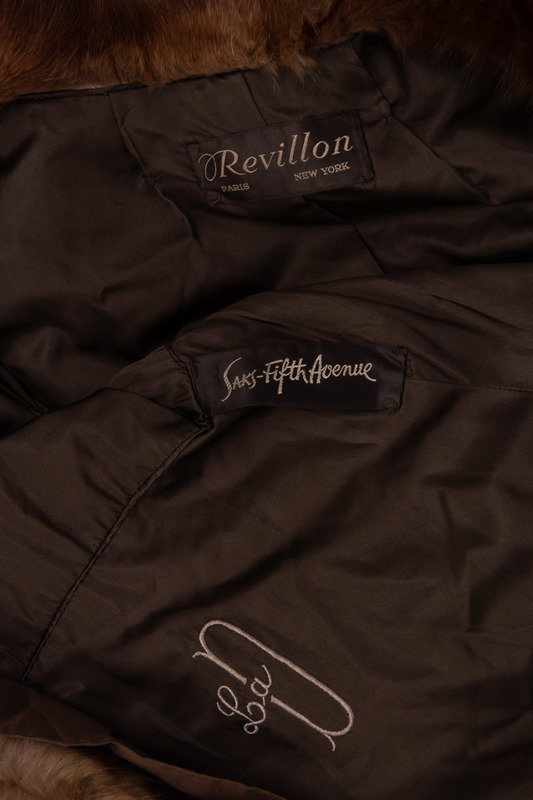 Brown sable fur coat with brown silk taffeta front inset and button closures, banded collar, and A-line fit. "LAD" Monogrammed on front right lining.