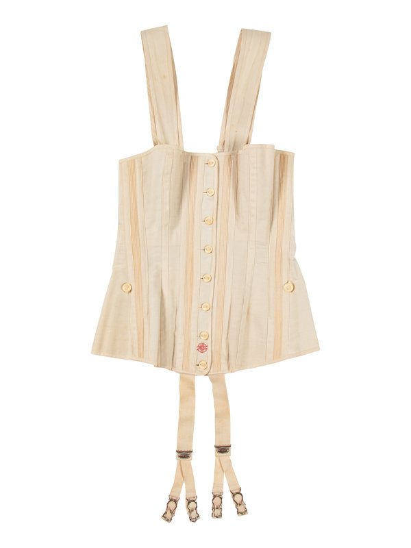 White cotton twill corset with shoulder straps, front post and loop closures, stocking clasps, and center back lace up closure. Laces are included, though likely not original.