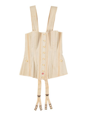 White cotton herringbone corset with shoulder straps, front button closures, elasticized stocking clasps, and center back lace up closures. Laces are not included.
