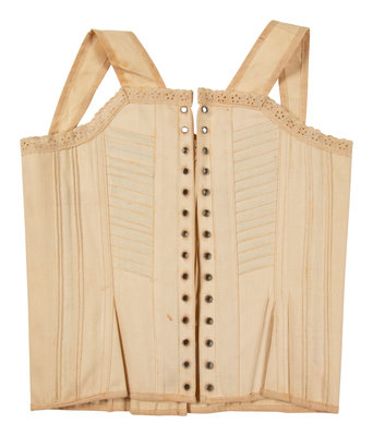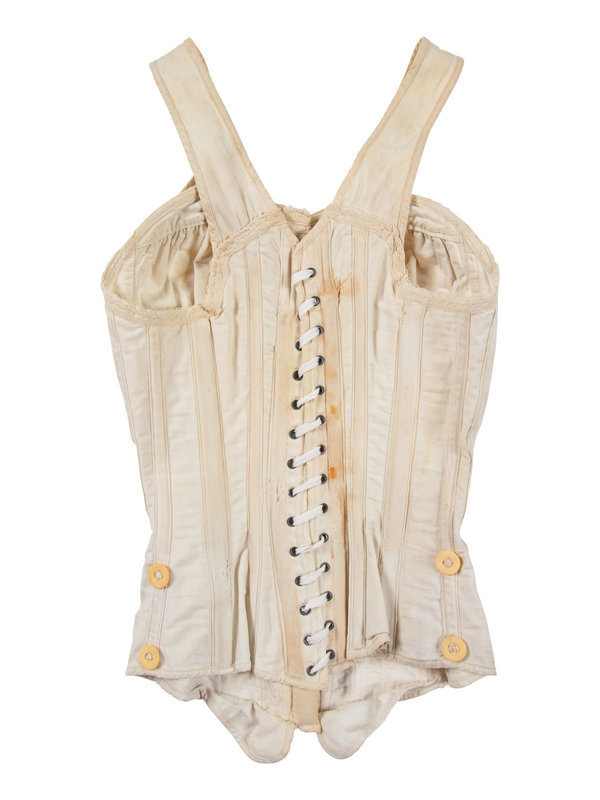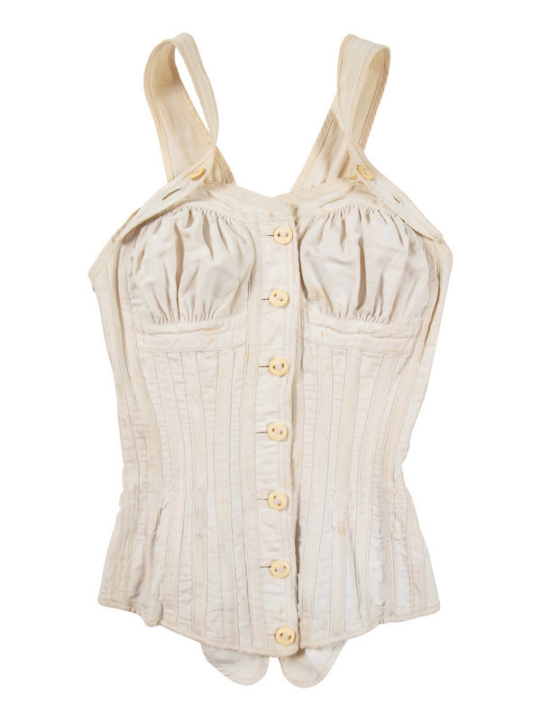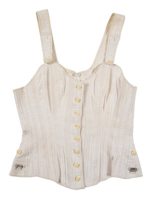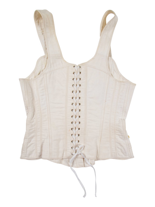 White cotton twill corset with shoulder straps, gathered bust with side pockets, center front button closures, and center back lace up closure. Laces are included, though likely not original.