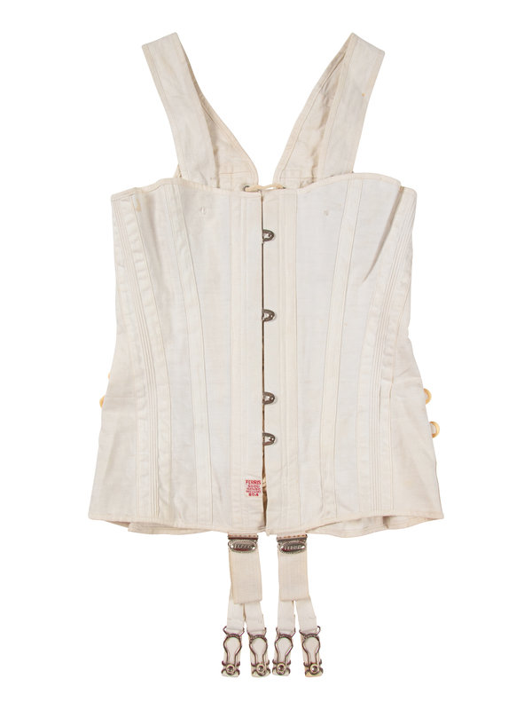 White cotton twill "Ferris Good Sense" youth corset with shoulder straps, front post and loop closures, elasticized stocking clasps, and center back lace up closure. Laces are not included. Reg. U.S. Pat. 804.