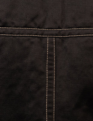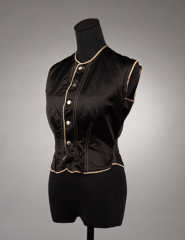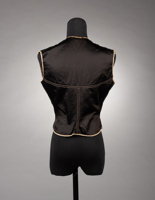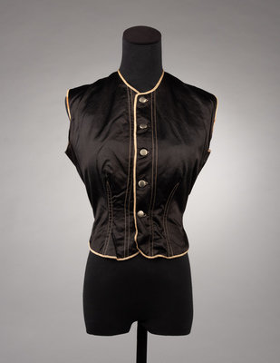 Black silk satin corset cover lined in white sueded leather, and front metal button closures.