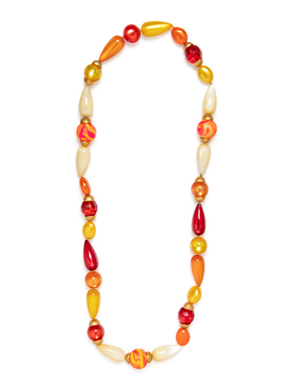 Large orange, red, and yellow plastic bead necklace with soft gold-tone caps and beads.