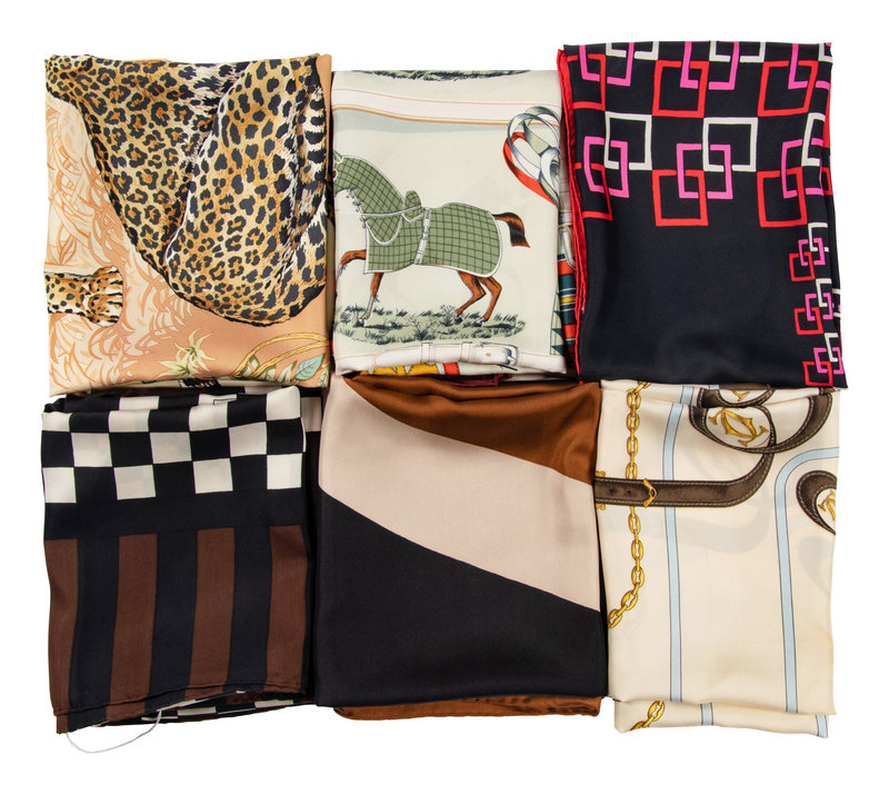 Collection of Six Designer Scarves; Two Hermes, Two YSL, One Dior, One Cartier