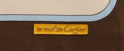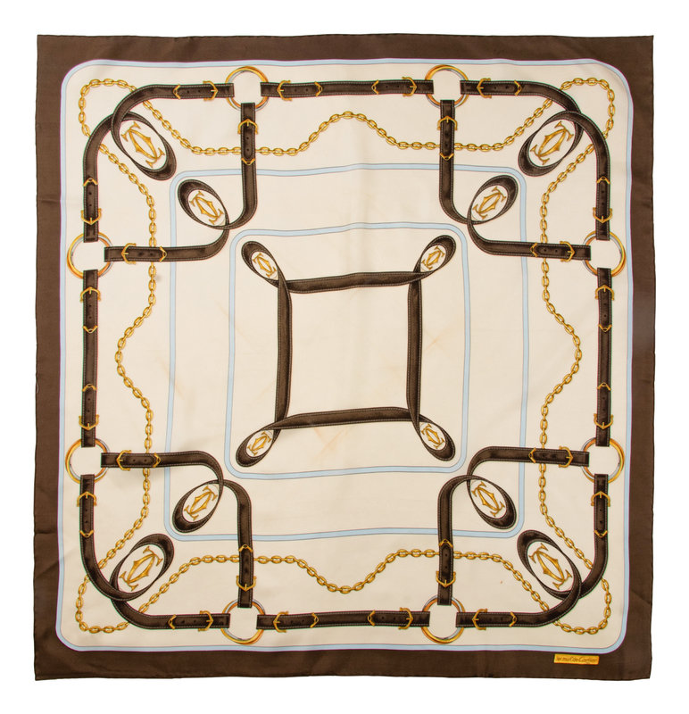 Brown and cream silk scarf with golden yellow and light blue in a leather harness and gold chain print.