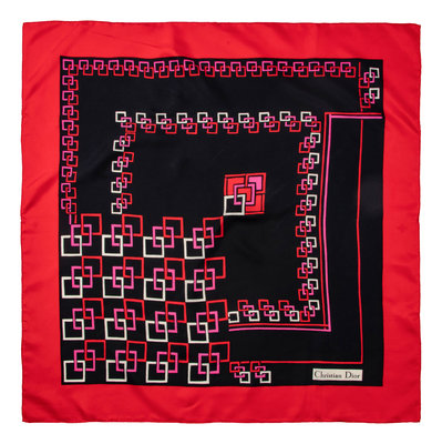Red and navy blue silk scarf with pink, white, and red linked square print.