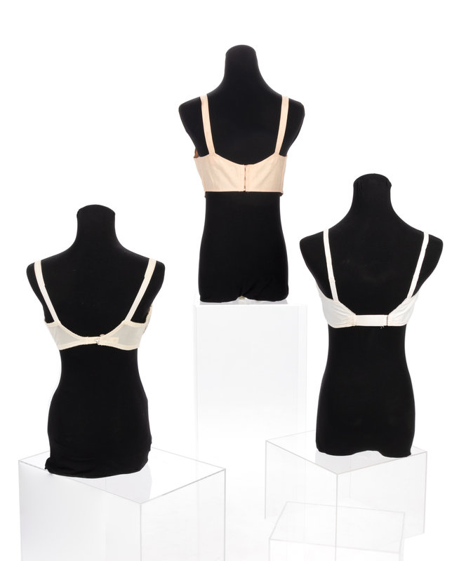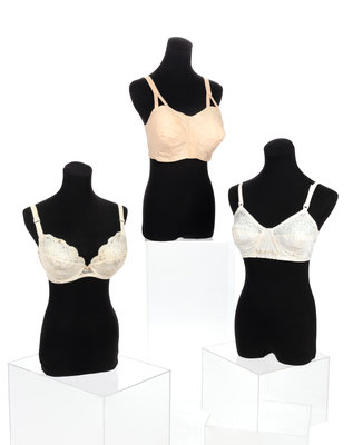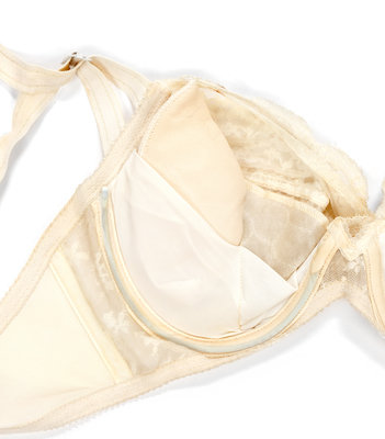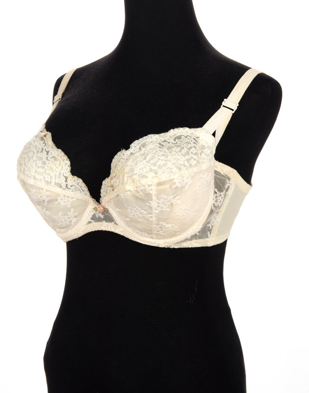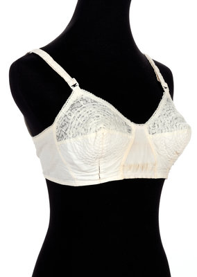 White net machine made lace brassiere with adjustable elasticized straps, net and lace bands, bust enhancement padding that can be placed in one of two pockets on the inside of each cup, and adjustable hook and eye closure.