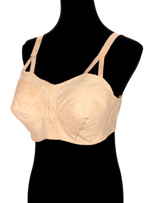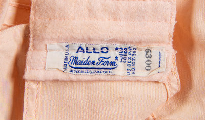 Pink Allo Maiden Form bra with pleated front bridge and cups, pink satin straps, and adjustable hook and eye closure. Patented in 1937.