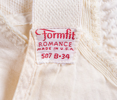 White Formfit bra with quilted lace and cotton cups, elasticized bridge, and adjustable straps and back hook and eye closures.