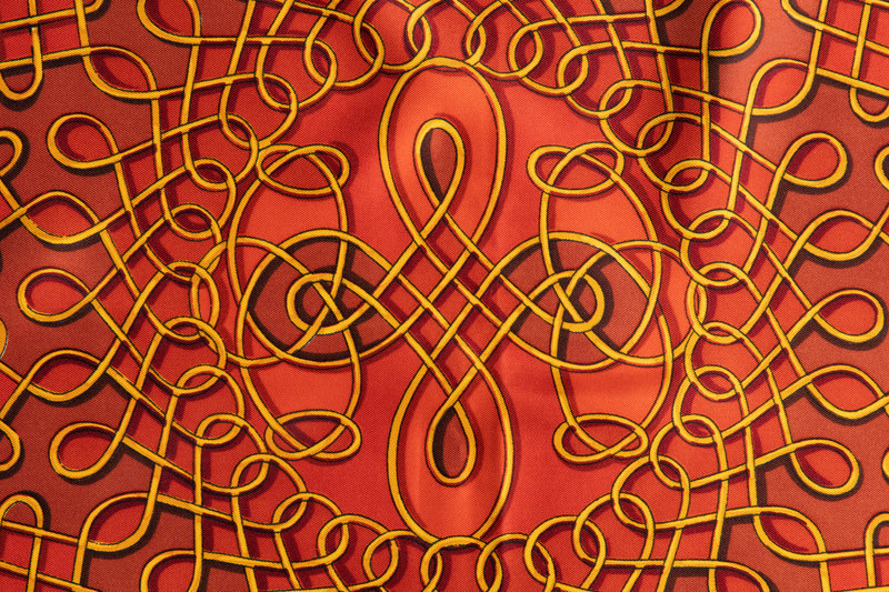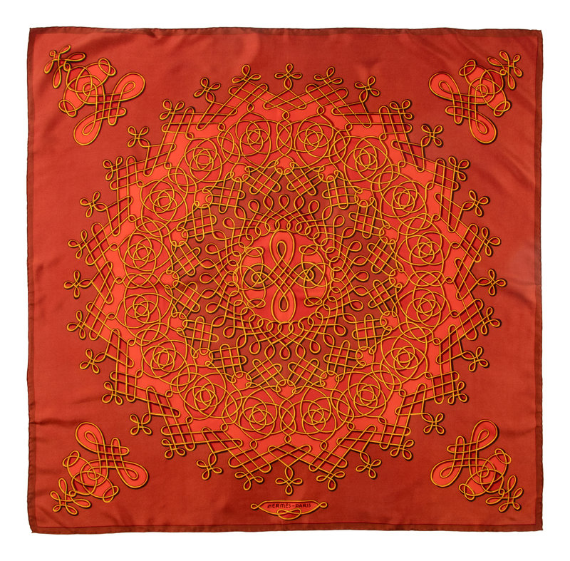 Rust red and orange silk scarf with yellow braided print.
