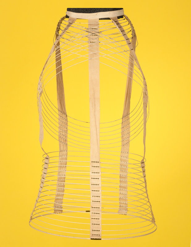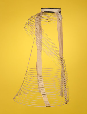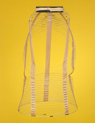 Thin metal wire band and cotton tape skirt hoop and bustle. "BYOP" is written in black marker on the left waistband.