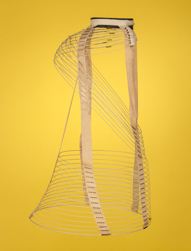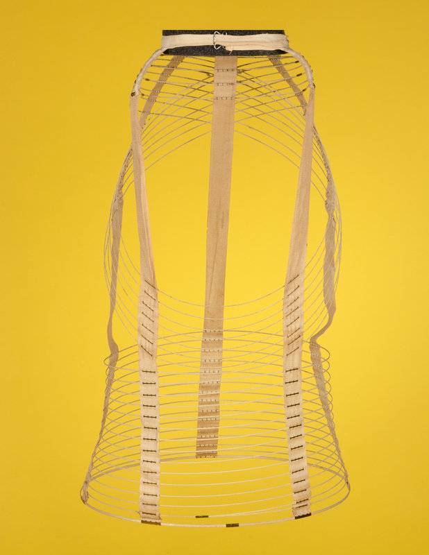 Crescent shaped flattened metal coil and metal reed skirt supporter covered in cotton satin.
