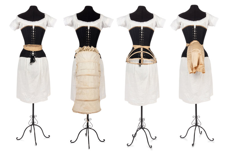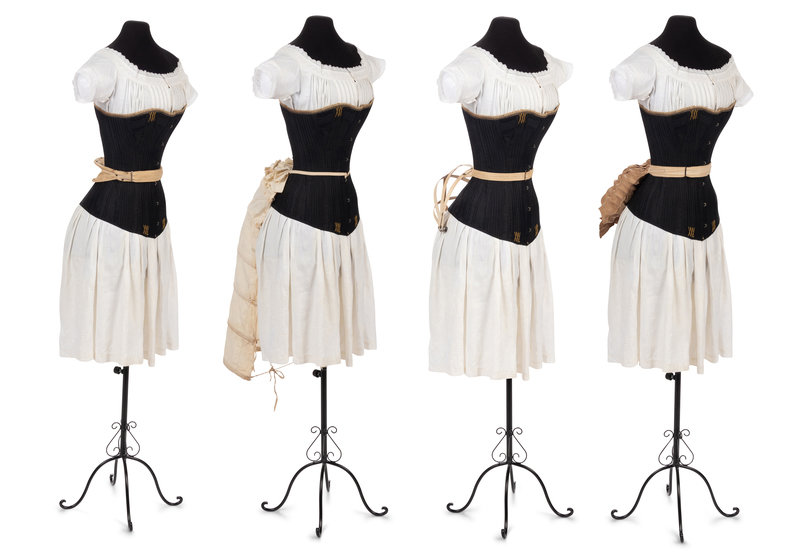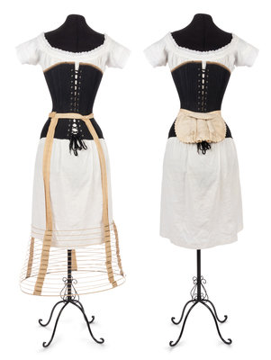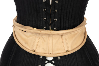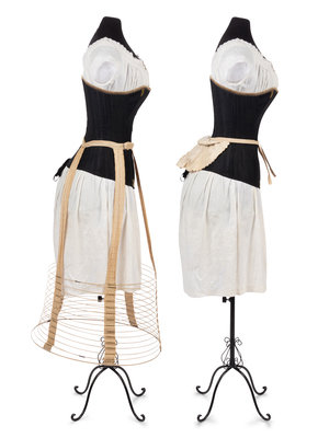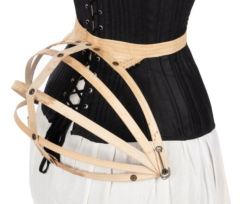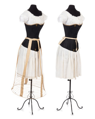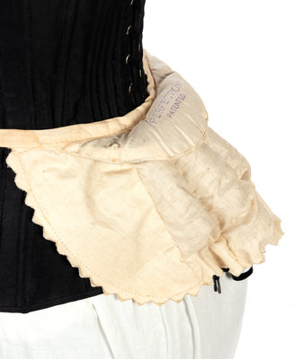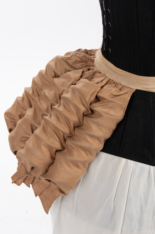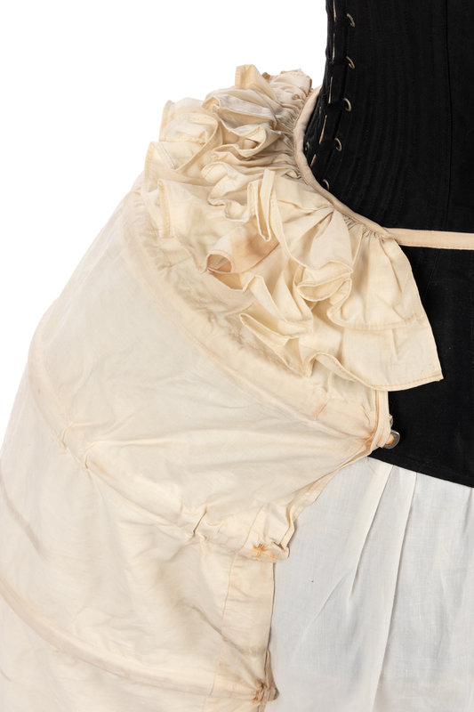 Collapsible long bustle with flat metal bands, tie backs, and covered in cotton, topped with ruffles, and hook and eye waistband closure.