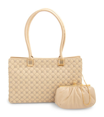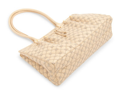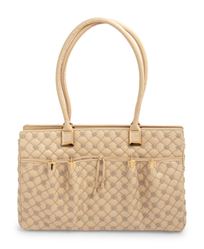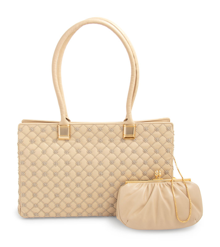 Ivory leather shoulder bag with white floral embroidery throughout, gold-tone hardware, front gathered side pocket, and attached snap frame cosmetics bag; paired with tasseled comb, mirror, and coin purse. Comes with box.