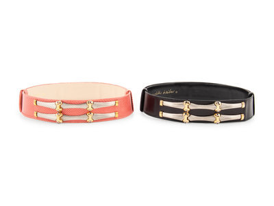 Black Karung snake skin adjustable belt with gold-tone and silver-tone bar buckle set with red stones.
