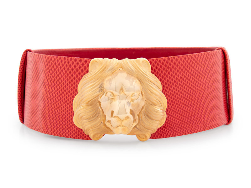 Red Karung snake skin adjustable belt with gold-tone lion head buckle. Comes with a dust bag.