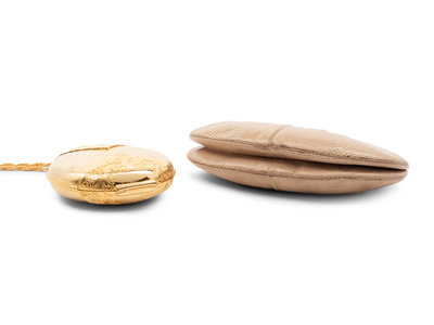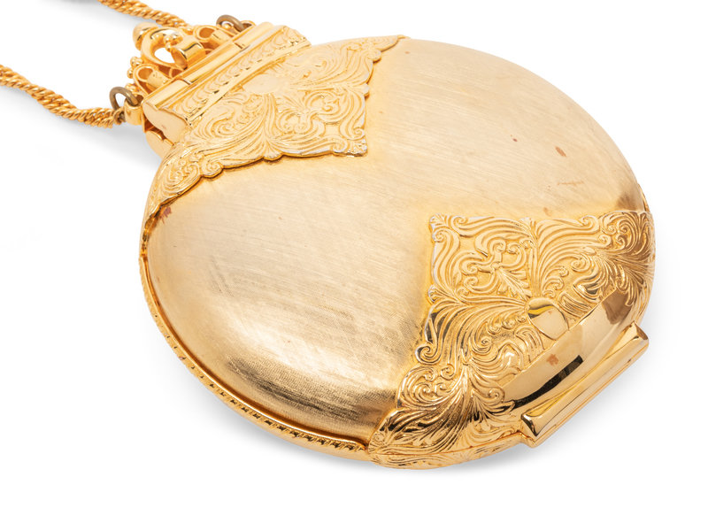 Circular gold-tone etched metal minaudière with molded gold-tone hinge and top clasp.