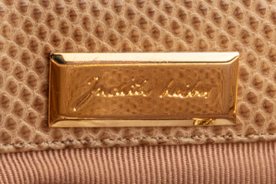 Taupe Karung snakeskin shirred bag with double hinged gold-tone frame and hinged chain shoulder strap.