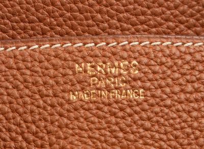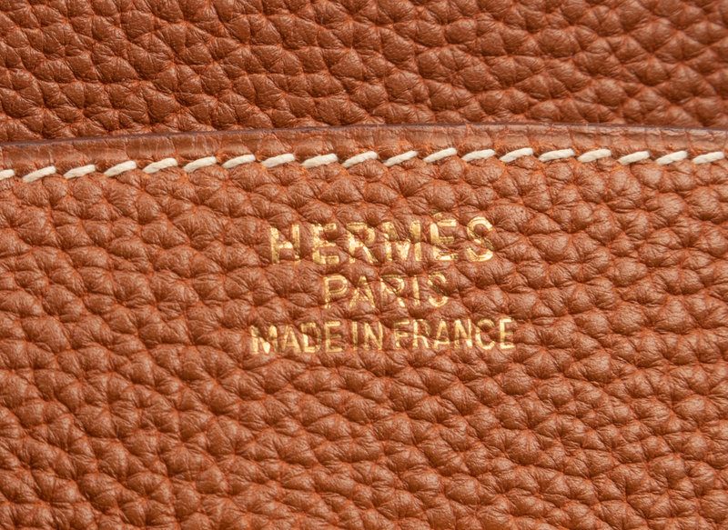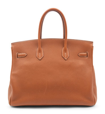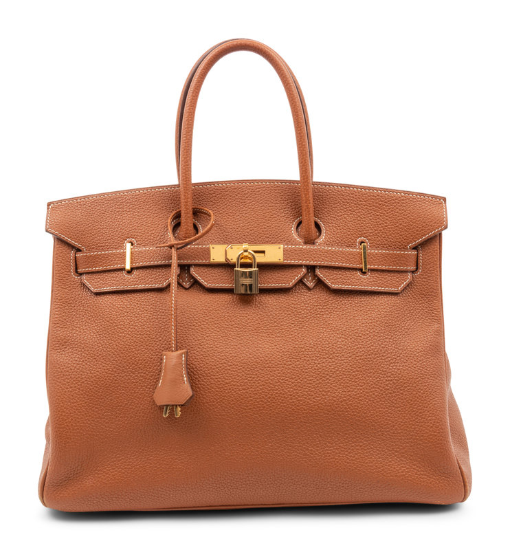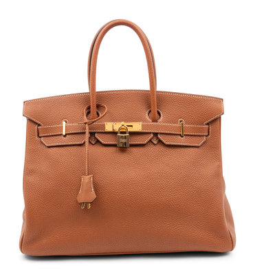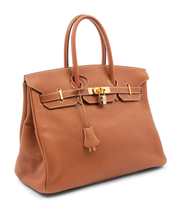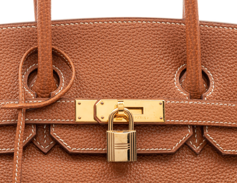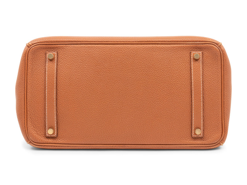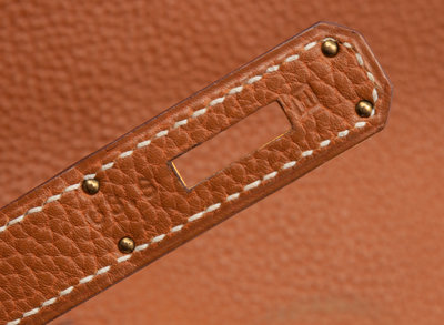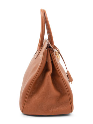 Noisette chevre goatskin leather Birkin with gold-tone hardware, lock, and clochette with keys.