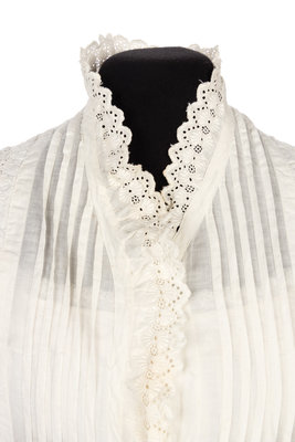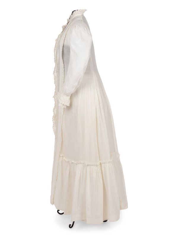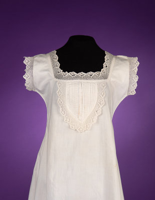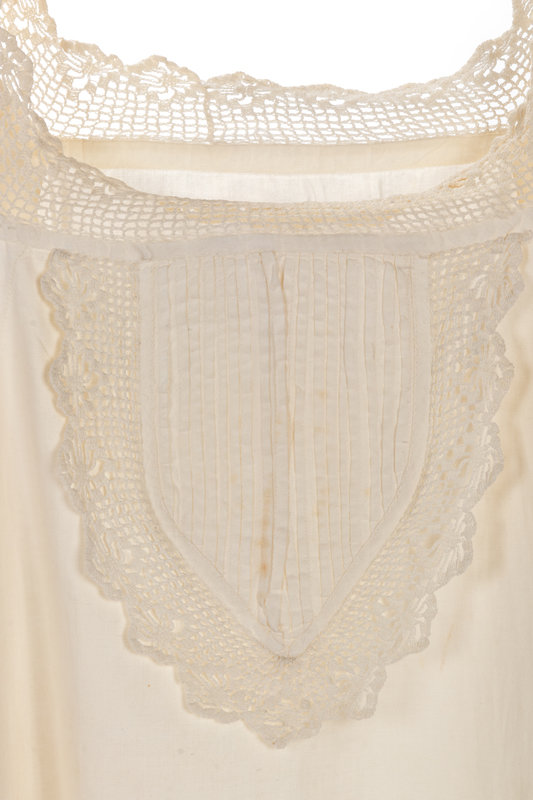 White cotton pull-over chemise with crocheted lace box neckline and armhole detail, and front pleated with crocheted lace applique.