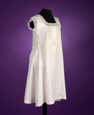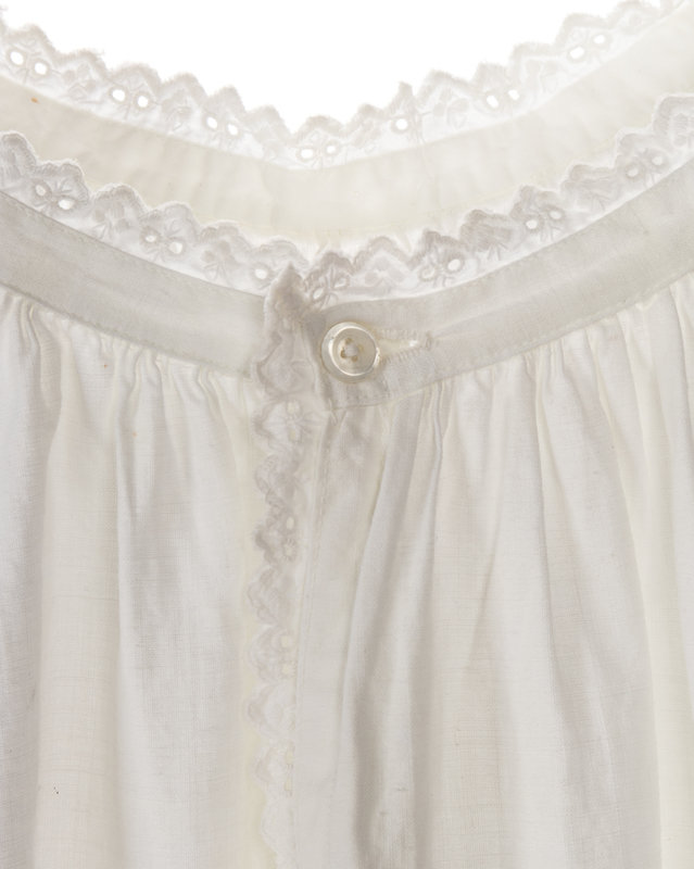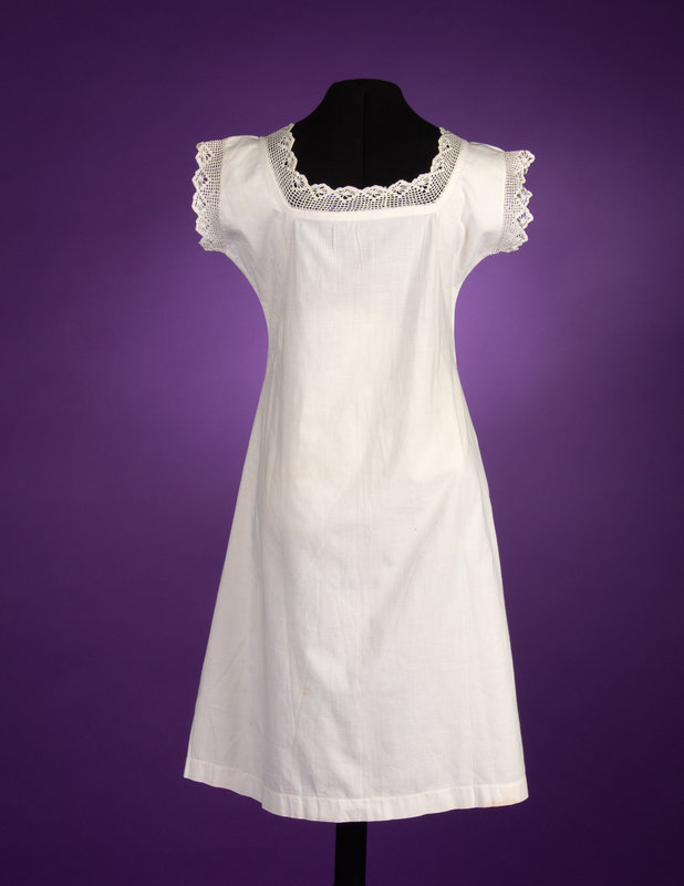 White cotton chemise with box neckline trimmed in white cotton eyelet lace, front gathered and pleated neckline and flared hemline. "Mary B. (illegible)" is handwritten on the interior right front neckline opening.