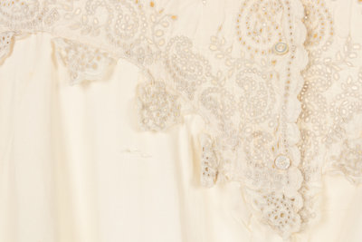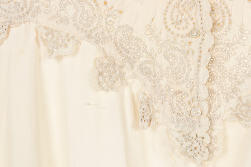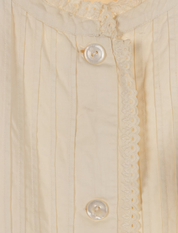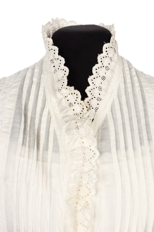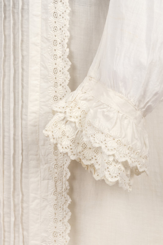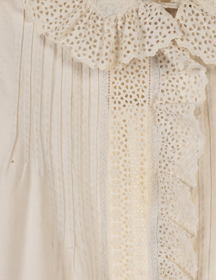 White cotton bed jacket with collar and full sleeves trimmed in eyelet lace, front upper bodice pin tucking detail, and front button closures. There are a couple of handwritten names and numbers along the back neckline, likely from collection accessioning.