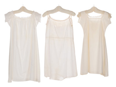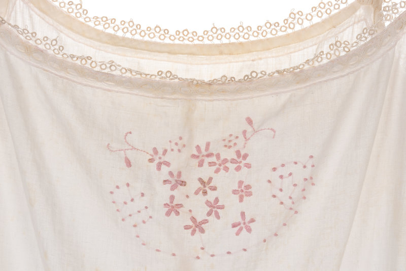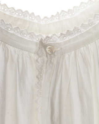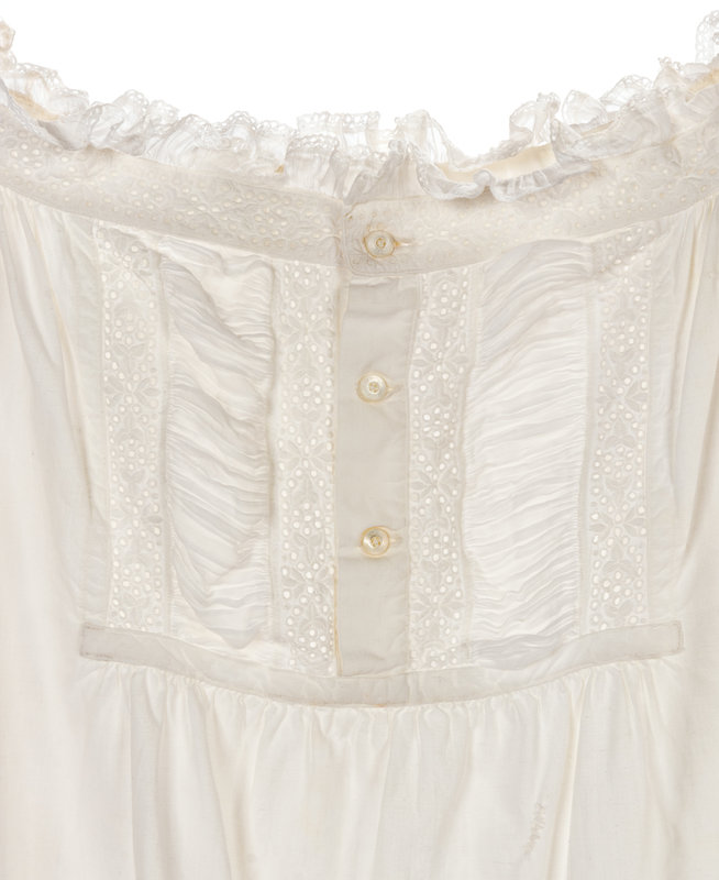 White cotton chemise with pin tuck pleating and eyelet trim along the neckline and sleeves. The owner's name (illegible) is stamped on the interior back neckline.