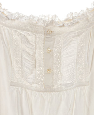 White cotton A-line chemise with eyelet trim and shirred front button down bib.