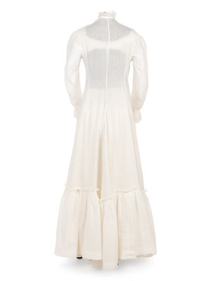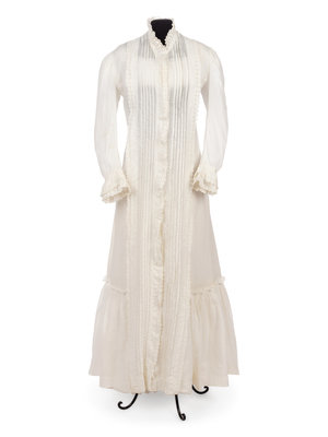 White cotton bed jacket trimmed with eyelet lace and pin tuck pleats down the front, full sleeves, ruffled hem, and center front button closures.