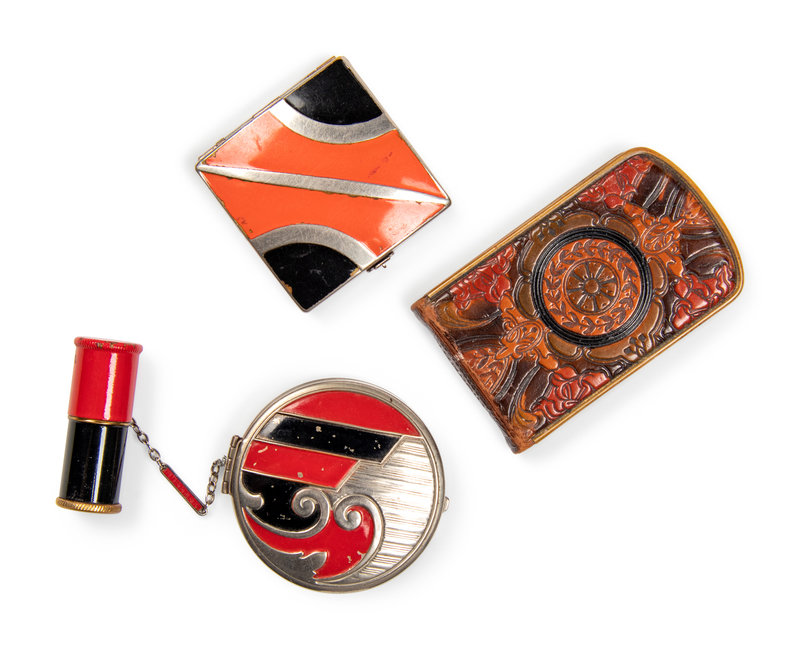 Silver-tone with inlaid red and black enamel compact with rouge and powder pallets with poufs, attached lipstick tube still with red lipstick.