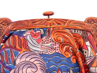 Deauville printed by Bianchini-Ferier, the Egyptianesque top possibly of bakelite, stained a mahogany colour, carved with mythical creatures, chain mail type handle, the satinised fabric printed with sea scenes to include a whale, fishing boat, sailors in a rowing boat, three bosses on the harbour side and buildings, all in bright orange, red, purple, pink, blue and brown, lined in mid blue fine silk, 7 in; 18 cm width of top."