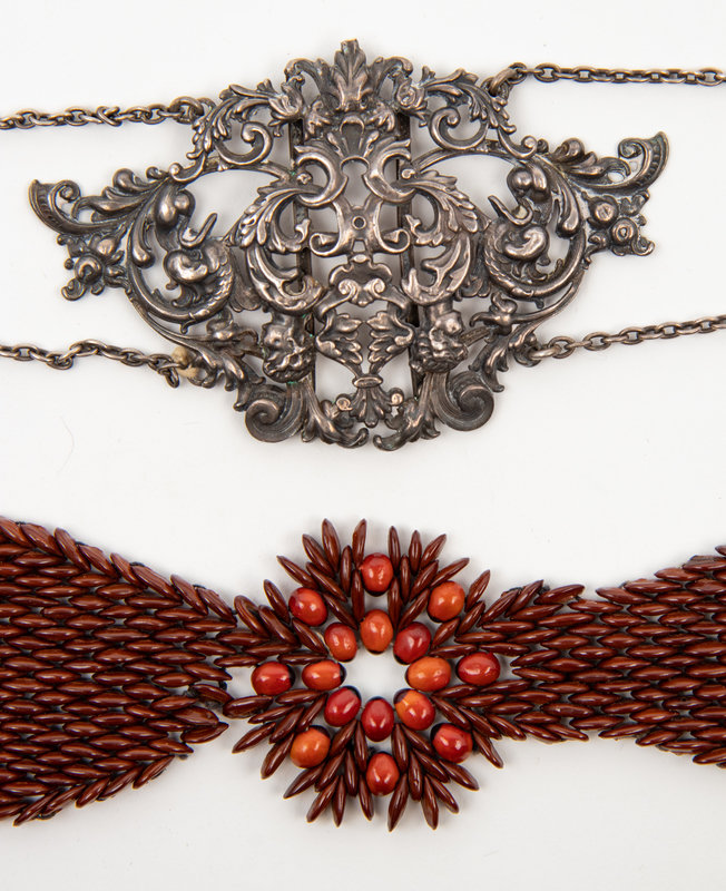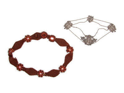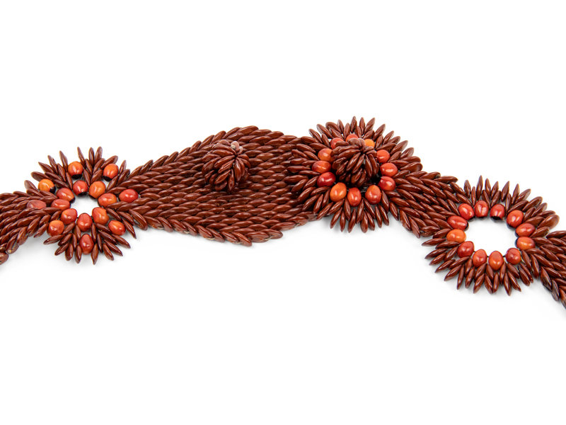 Red beaded belt made of various plant seeds in diamonds and circles with center back button closure.