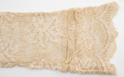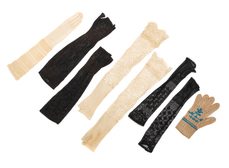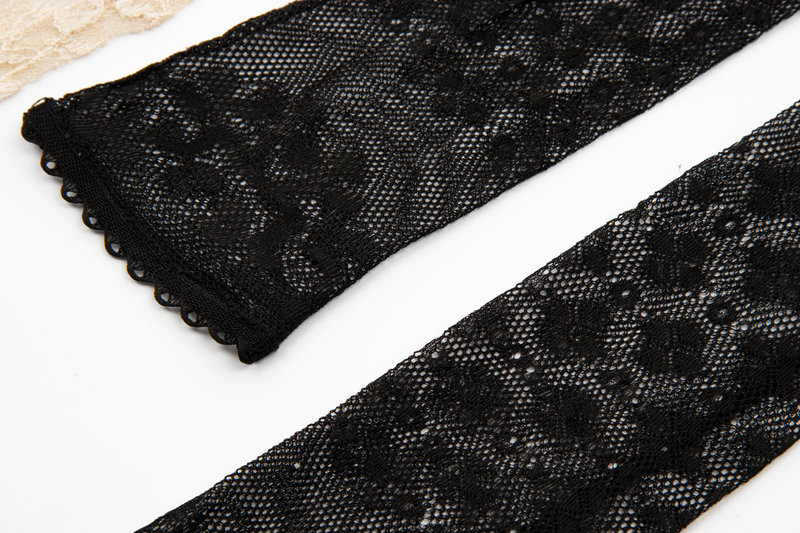 Pair of black lace fingerless gauntlets with chevron and geometric shape motif.