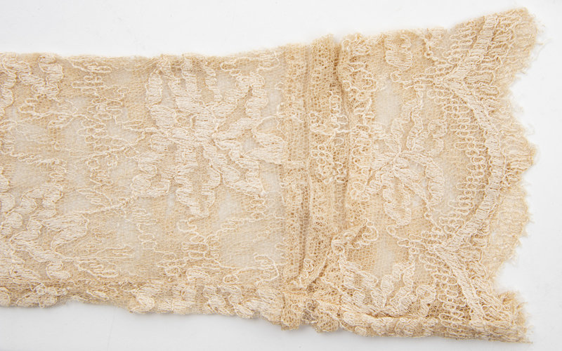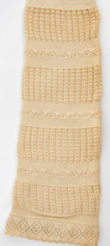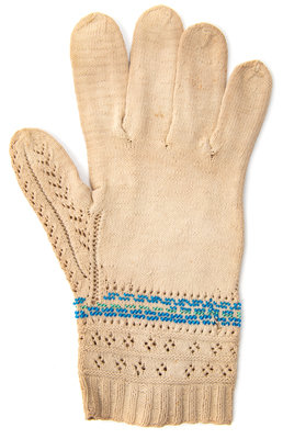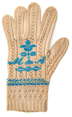 Single Bavarian off-white knit glove with blue and green seed bead embellishment.