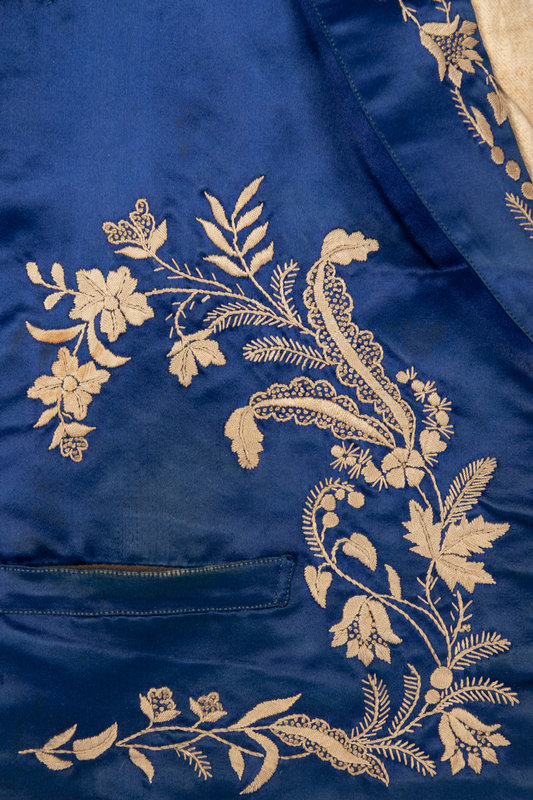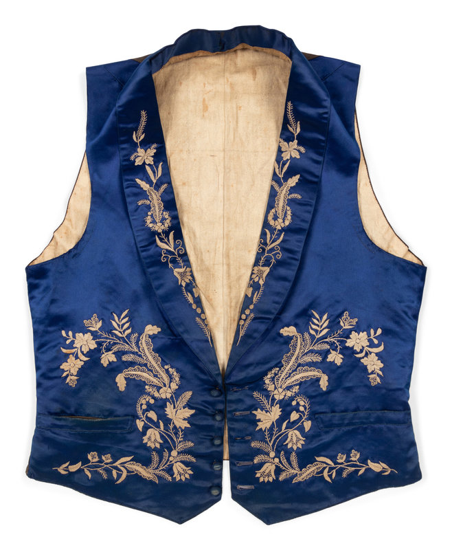 Royal blue silk satin vest with taupe floral embroidery on shawl collar and front panels, and front button closures.