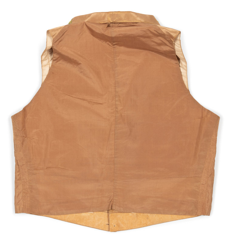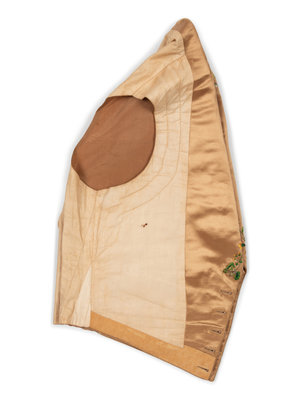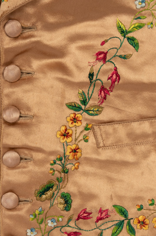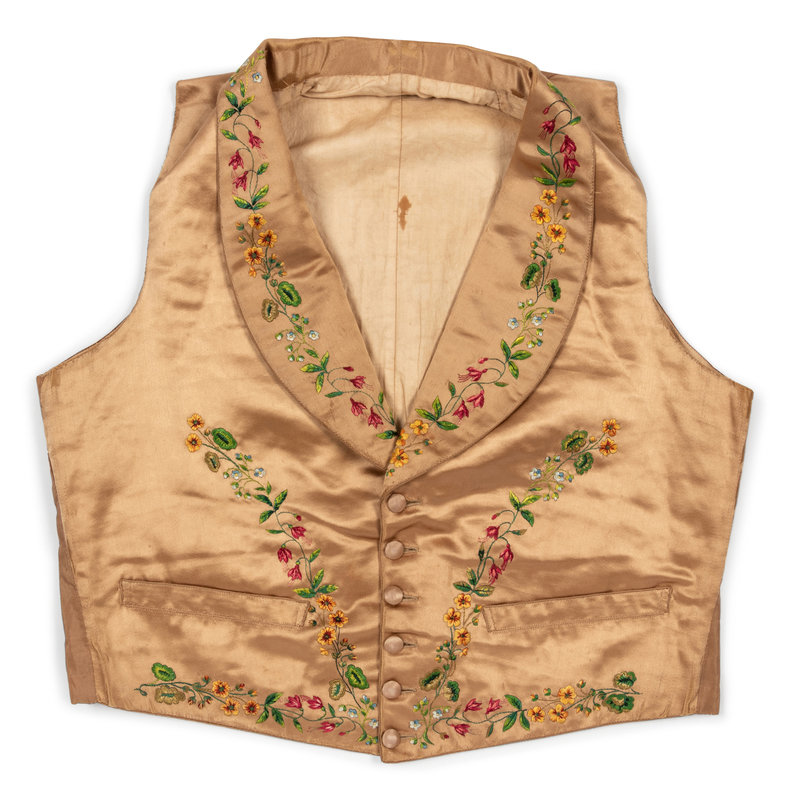 Tan silk satin vest with multi-hued floral embroidery along the shawl collar, front panels and hemline, padded front, and front button closures.