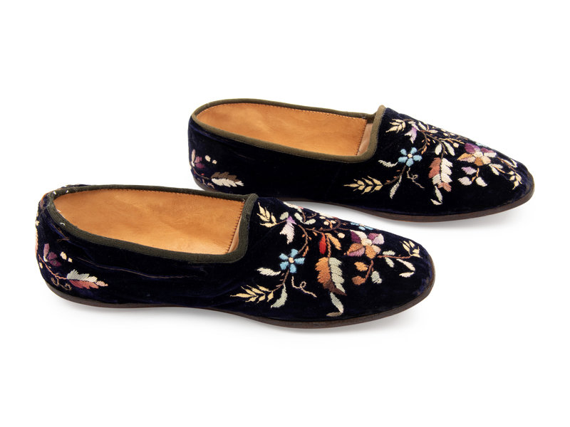 Navy velvet flats with floral embroidery and leather soles.