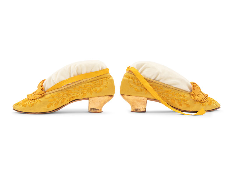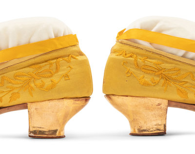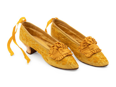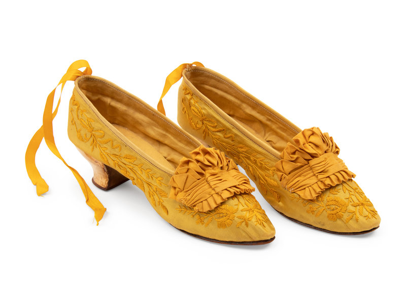 Golden yellow satin slippers with floral embroidery, gathered yellow satin detail on vamp, satin ribbon ankle ties, and golden metallic heels on leather soles.