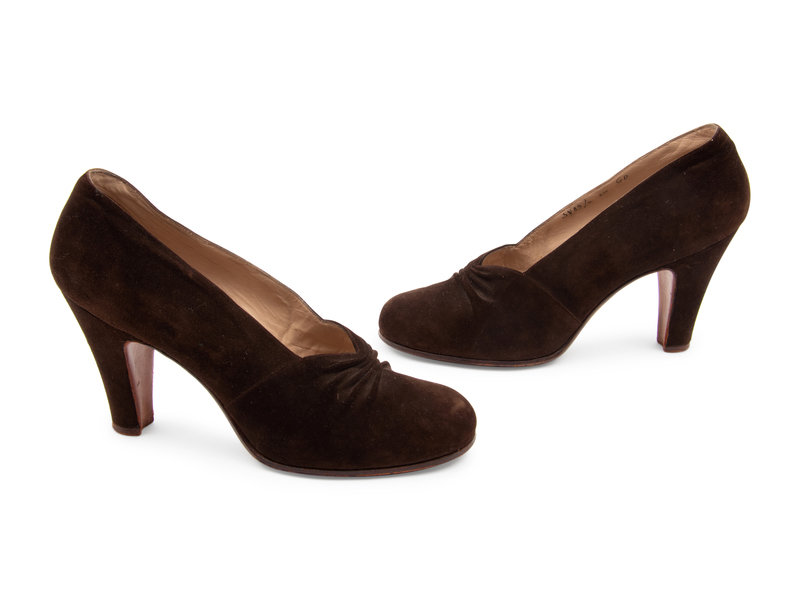 Brown suede slip on mid-heel pumps with shirred, almond-toe silhouette, and leather lining and foot bed.