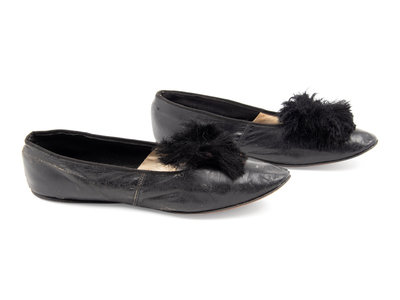 Black leather flats with silk thread pompoms.