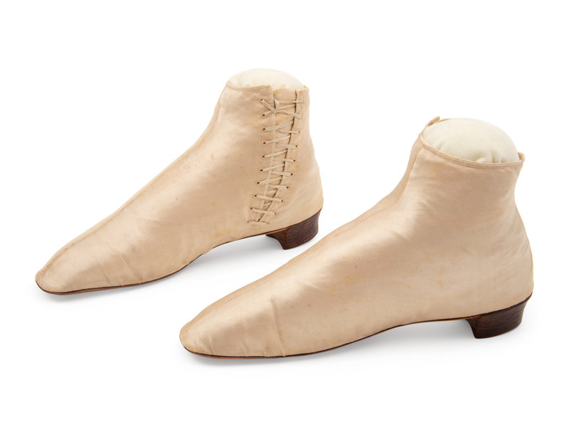 Ivory satin boots with cobbled leather soles and side lace up closures.