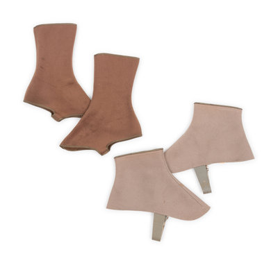 Brown wool felt boot top spats with plastic side button closure and built-in stirrup.