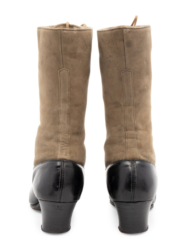 Black leather with gray green sueded shaft boots.