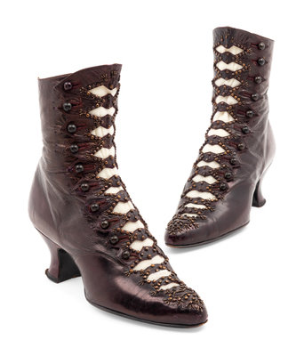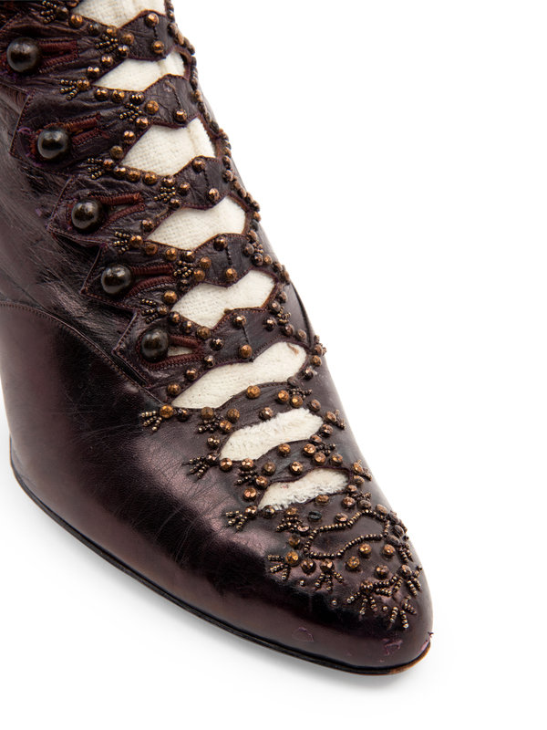 Bronzed purple leather boots with wood buttons and metal beads. Comes with pair of original wood shoe tree inserts.
