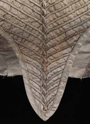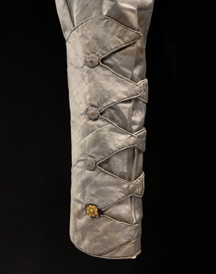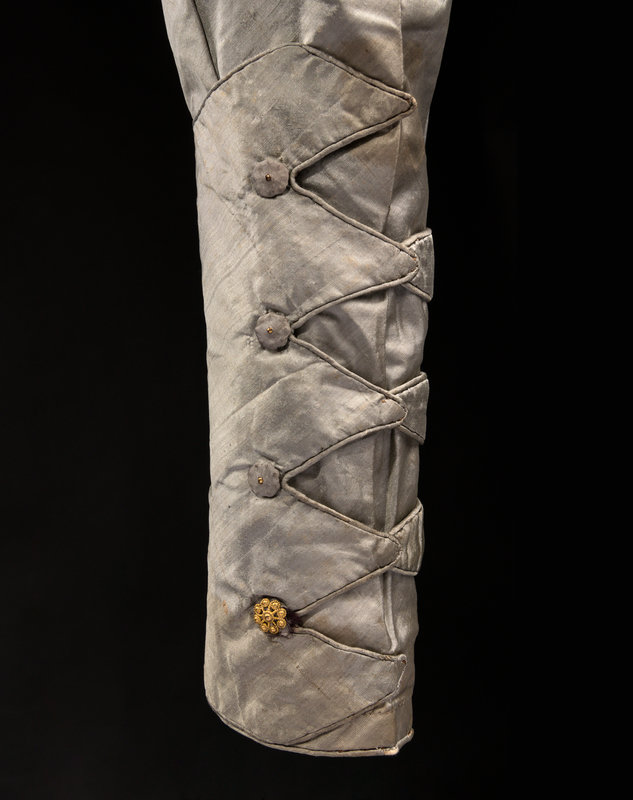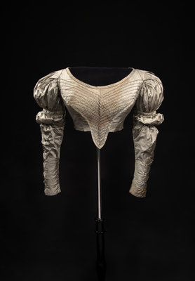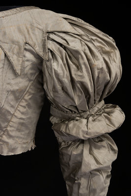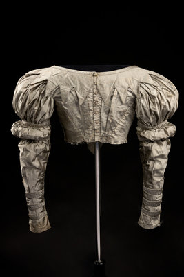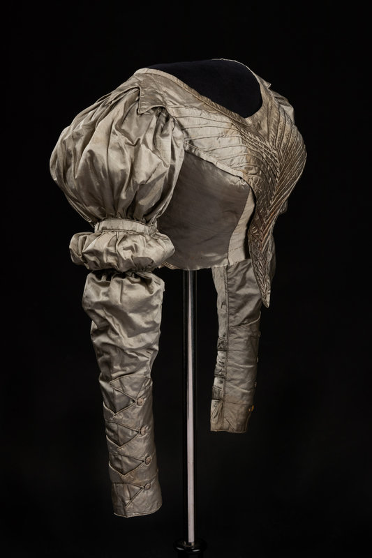 Silver gray silk bodice with shirred front trimmed in piping, close fitted puff sleeves, and wrapped gold-tone button closures and details. The bodice appears to have once been attached to a skirt.